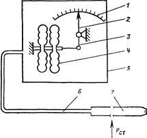 Рис. 9 Принципиальная схема работы высотомера ВД 10К 1-шкала, 2-стрелка 3-передаточный механизм 4 - анероидные коробки, 5 - корпус прибора 6-трубопровод статического давчения, 7- камера статического давления