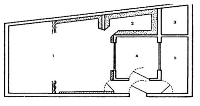 План типичного литературно-драматического блок а. До сих пор в эксплуатации находится немало таких студий. На рисунке цифрами показаны: 1 — основное помещение для записи действия пьесы: сравнительно «звонкую» (слева) и подглушенную (справа) части студии можно несколько изолировать друг от друга (и, соответственно, изменять акустическую обстановку в них) с помощью двойного занавеса, перемещаемого поперек студии; 2 — заглушенная студия, на стенах которой размещены эффективные поглотители; 3 — эхо-камера (или помещение для вспомогательной аппаратуры, в которой установлен листовой ревербератор); 4 — студийная аппаратная, где производится слуховой контроль записи и смешивание уровней сигналов: 5 — аппаратная магнитной записи. Неправильная форма помещения студии в этом примере дает то преимущество, что из-за непараллельности стен не возникают стоячие волны, придающие неприятную окраску звучанию.