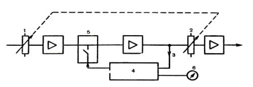 Простая схема компрессора/лимитера: 1 и 2— регуляторы порогового уровня (сопряженные механически). Часть сигнала программы 3 подается на боковую цепь 4, в которой есть регулировка закона ограничения и времени срабатывания, затем на управляющий элемент 5, включенный в основной канал. Степень уменьшения сигнала показана на индикаторе 6.