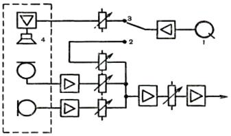Акустическая добавка. Магнитофон или проигрыватель 1, сигнал от которых обычно подается на микширующее устройство через контакт 2, иногда (если записанное звучание «сухо», и реверберация студни «оживит» его) включают через контакт 3 к контрольному громкоговорителю студии 4.