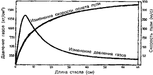 Второй период длится от момента полного сгорания порохового заряда до момента вылета пули из канала ствола. С началом этого периода приток пороховых газов прекращается, однако сильно сжатые и нагретые газы продолжают расширяться и, продолжая оказывать давление на пулю, увеличивают скорость ее движения. Спад давления во втором периоде происходит довольно быстро и у дульного среза составляет у винтовки 570-600 кг/см2. Третий период, или период последействия газов, длится от момента вылета пули из канала ствола до момента прекращения действия пороховых газов на пулю. В течение этого периода пороховые газы, истекающие из канала ствола со скоростью 1200-2000 м/с, продолжают действовать на пулю и сообщают ей дополнительную скорость. Наибольшей, максимальной, скорости пуля достигает в конце третьего периода на удалении нескольких десятков сантиметров от дульного среза ствола. Этот период заканчивается в тот момент, когда давление пороховых газов на дно пули будет уравновешено сопротивлением воздуха. Какое практическое значение имеет все вышеизложенное? Посмотрите на схему-график 111 по винтовке калибра 7,62 мм. Исходя из данных этого графика, становится понятным, почему длину винтовочного ствола практически не имеет смысла делать более 65 см. Если его делать длиннее, скорость пули возрастает очень незначительно, а габариты оружия бессмысленно увеличиваются. Становится понятно, почему трехлинейный карабин с длиной ствола 47 см и скоростью пули 820 м/с имеет практически такие же боевые качества, как и трехлинейная винтовка с длиной ствола 67 см и начальной скоростью пули 865 м/с. Аналогичная картина наблюдается и у малокалиберных винтовок (схема-график 112) и особенно у оружия под 7,62-миллиметровый автоматический патрон образца 1943 года. Длина нарезной части ствола автомата АКМ составляет всего 37 см при начальной скорости пули 715 м/с. Длина нарезной части ствола ручного пулемета Калашникова, стреляющего теми же патронами, - 54 см, на 17 см больше, а пуля разгоняется незначительно - начальная скорость пули 745 м/с. Но у винтовок и пулеметов ствол приходится делать удлиненным для большей кучности боя и для удлинения прицельной линии. Эти параметры обеспечивают повышенную точность стрельбы.