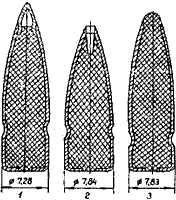 При стрельбе на обычные прицельные дистанции пули всех образцов боевого стрелкового оружия имеют многократный запас энергии. Например, при стрельбе тяжелой пулей из снайперской винтовки на дальность 2 км энергия пули у цели равна 27 кг м. Эффект действия пули по живым целям зависит не только от энергии пули. Большое значение имеют такие факторы, как "боковое действие", способность пули к деформации, скорость и форма пули. "Боковое действие" - удар в стороны - характеризуется размерами не только самой раны, но и размером поражаемой ткани по соседству с раной. С этой точки зрения остроконечные длинные пули обладают большим "боковым" действием вследствие того, что длинная пуля с легкой головной частью начинает "кувыркаться" при попадании в живую ткань. Так называемые "кувыркающиеся" пули со смещенным центром тяжести были известны еще в конце прошлого столетия и неоднократно запрещались международными конвенциями по причине чудовищного воздействия: кувыркающаяся по организму пуля оставляет после себя канал сантиметров пять в диаметре, наполненный размозженным фаршем. В общевойсковой практике отношение к ним двойственное - эти пули, разумеется, убивают наповал, но в полете они идут на пределе устойчивости и нередко начинают кувыркаться даже от сильных порывов ветра. Кроме того, пробивное действие по цели кувыркающимися пулями оставляет желать лучшего. Например, при стрельбе такой пулей через деревянную дверь кувыркающаяся пуля проделывает в двери огромную дыру, и на этом ее энергия исчерпывается. Цель, находящаяся за этой дверью, имеет шанс уцелеть. Способность пули к деформации увеличивает поражаемую область. Безоболочечные свинцовые пули при попадании в ткань живого организма деформируются в передней части и дают очень тяжелые ранения. В охотничьей практике для стрельбы по крупному зверю из нарезного оружия применяются так называемые экспансивные разворачивающиеся полуоболочечные пули. Ведущая часть этих пуль и немного головной части заключены в оболочку, а носик оставлен ослабленным, иногда просто из рубашки "выглядывает" свинцовая заливка, иногда эта заливка прикрыта колпачком, иногда в головной части выполняется встречный корпус (схема 120). Эти пули иногда разрываются на части при встрече с целью и поэтому в старину назывались разрывными (это неправильное название). Первые образцы таких пуль изготавливались в 70-х годах XIXстолетия в арсенале Дум-Дум вблизи Калькутты, и поэтому название Дум-Дум прилипло к полуоболочечным пулям разных калибров. В армейской практике такие пули с мягким носиком не применяются из-за небольшого пробивного действия.