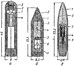 До Второй мировой войны в армиях некоторых стран (в частности, СССР и Германии) применялись так называемые пристрелочно-зажигательные пули. По идее они должны были давать яркую вспышку в момент встречи даже с фанерным щитом обычной мишени. Пули эти и в СССР, и в Германии имели одинаковую конструкцию. Принцип их действия обычно был основан на том, что ударник, находящийся на оси пули и предназначенный для накола капсюля, в походном состоянии удерживался на месте взаимно сомкнутыми грузиками-противовесами. Эти противовесы при выстреле и вращении пули центробежной силой расходились в стороны, освобождали или взводили ударник. При встрече с целью и торможении пули ударник накалывал капсюль, который воспламенял зажигательный состав, давая очень яркую вспышку. Когда-то в ДОСААФ, куда отдавали для учебных целей всякий патронный "сброд", ненужный в армии, автор стрелял такими патронами выпуска 1919 (!) г. Патроны были с латунной гильзой и латунной оболочкой пули, порох от старости детонировал и оружие сильно било в плечо. На дистанции 300 м вспышки от попадания этих пуль были заметны в яркий солнечный день невооруженным глазом. Эти пули, по существу, являлись разрывными, ибо они по-настоящему разрывались на осколки при попадании в фанерный щит. При этом образовывалась дыра, в которую можно было просунуть кулак. По рассказам очевидцев, попадания такими пулями по живой цели имели ужасные последствия. Этот боеприпас был запрещен Женевской конвенцией и во время Второй мировой войны не производился, разумеется, не в целях гуманизма, а по причине дороговизны в производстве. Старые запасы патронов с такими пулями пошли в ход. Для снайперской стрельбы такие пули непригодны по причине большого (очень большого) рассеивания. Носик пристрелочно-зажигательной пули, так же, как и у обычной зажигательной, окрашивается в красный цвет. Это и были те самые знаменитые разрывные пули, которые не афишировались ни у нас, ни в Германии. Их устройство представлено на схемах 127, 128.