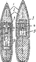 При ведении боевых действий невозможно обойтись без пуль специального действия - бронебойных, зажигательных, трассирующих и т. д. Патроны с бронебойными пулями предназначены для поражения противника за бронированными укрытиями. От обыкновенных пуль бронебойные отличаются наличием броневого сердечника высокой прочности и твердости. Между оболочкой и сердечником обычно находится мягкая свинцовая рубашка, облегчающая врезание пули в нарезы и предохраняющая канал ствола от интенсивного износа. Иногда бронебойные пули не имеют специальной рубашки. Тогда оболочка, являясь корпусом пули, изготавливается из мягкого материала. Так устроена французская бронебойная пуля (3 на схеме 121), состоящая из томпакового корпуса и стального бронебойного сердечника. Носик бронебойной пули окрашен в черный цвет.