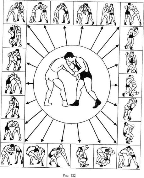 Особенность этих захватов в том, что они являются «связью» между подготовительными операциями и атакой. Именно их мы называем атакующими захватами. Основные атакующие захваты в стойке характеризуются следующими признаками: безопасностью, прогнозированием действия соперника, преимуществом атаки, широтой применения возможных технико-тактических действий. В соответствии с первым признаком борец, осуществляя один из шести атакующих захватов, ограничивает активные действия соперника. Блокированием части тела соперника практически на 50% из 100% борец лишает его возможности выполнять атакующие действия. С целью активизации соперник может осуществить активную защиту и после этого контратаковать. Своим действием борец создает, во-первых, безопаность для себя и, во-вторых, — дополнительную «нагрузку» сопернику при переходе к активным действиям. Второй признак говорит о том, что, осуществив атакующий захват, борец может заранее программировать свои технические действия и прогнозировать защитные и контратакующие действия соперника. Знание ограниченности действий соперника позволяет борцу контролировать его и в нужный момент самому перейти к проведению атакующих действий. Третий признак позволяет борцу с атакующего захвата проводить 8—9 различных действий, тогда как у соперника в арсенале их остается всего 1—2. В соответствии с четвертым признаком борец применяет атакующие захваты и в то же время импровизирует, сочетая их с другими атакующими захватами. Таким образом, он создает, с одной стороны, «фон» борьбы, который вызывает у судей благосклонность к «активности», а с другой — благоприятные условия для реализации собственных действий. Захваты как способ связи элементов техники и тактики. Как уже отмечалось, в ходе схватки борец оказывает механическое воздействие на соперника посредством применения различных захватов (атакующих). Кроме того, поединок на ковре проходит в постоянном конфликте между борцами. Поэтому выполнение каждого технико-тактического действия требует «включения» в определенной последовательности различных мышечных групп, умелого использования веса, инерции, рычагов тела, предельного внимания, готовности в любой момент использовать различные захваты, и тем самым изменить направление атаки. В связи с этим осуществляемое борцом технико-тактическое действие вбирает в себя очень много операций, в последующем переходящих в элементы действия. Каждый элемент действия осуществляется посредством захвата. Отсюда захват является связующим звеном в построении целостного действия. Захваты для реализации приемов, атак, защит, контрприемов. Захваты являются частью действия, так как борец не может приподнять, бросить или свалить соперника, не захватив какую-либо часть его тела. Именно от захвата зависит результат проведенного приема, защиты, контрприема. Существуют атакующие действия, в которых прием выполняется одновременно с захватом, например бросок в стойке сбиванием захватом двух ног. Есть другая разновидность атаки, когда приему предшествует многократная смена захватов, например переворот переходом ножницами захватом за подбородок. Чтобы более подробно разобраться в этих ситуациях, следует вновь обратиться к рис. 122, на котором показаны 22 способа взаимных захватов с потенциальными возможност