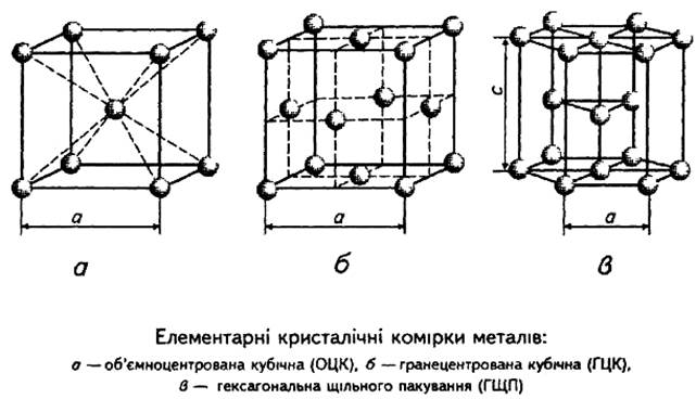 Кристали — тверді тіла з дискретним та упорядкованим розташуванням атомів, які утворюють просторову кристалічну ґратку. Експериментально доведено, що в кристалічних твердих тілах атоми знаходяться у вузлах кристалічної ґратки. Характеристики кубічної та гексагональної систем Більшість кристалічних ґраток металів належать до кубічної та гексагональної систем. Кубічна система, у свою чергу, може бути простою чи складною. Остання утворюється тоді, коли іони розміщуються не лише у вершинах куба, а й у його центрі - об'ємо-центрична кубічна (ОЦК) — або в центрах його граней - гранецентрична кубічна (ГЦК).