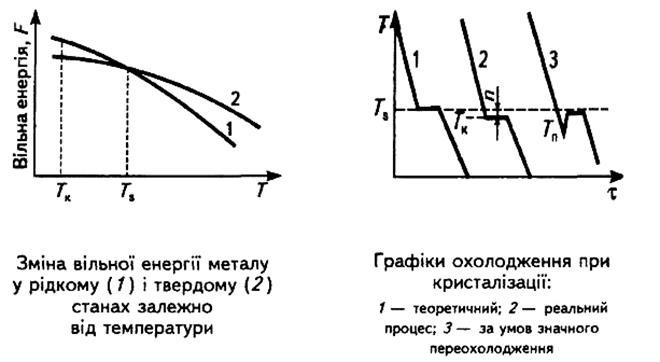 Кристалізацією називають перехід металів з рідкого стану в твердий (кристалічний). Відбувається вона внаслідок переходу системи до термодинамічно більш стійкого стану з меншою вільною енергією1 або термодинамічним потенціалом, тобто коли вільна енергія кристала менша від вільної енергії рідкої фази. Вільна енергія системи, що має величезне число охоплених тепловим рухом частинок (атомів, молекул), становить F = U - TS, де U — повна енергія системи; Т — абсолютна температура; S — ентропія (характеризує тепловий стан тіла).