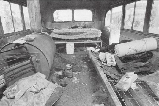 В передней части автобуса, на самодельном фанерном столике рядом с керосиновой лампой разложены миски и банки МакКэндлесса. На длинных кожаных ножнах для мачете затейливо выгравированы инициалы Р.Ф.: подарок Рона Франца. Синяя зубная щетка лежит рядом с ополовиненным тюбиком Колгейта, упаковкой зубной нити и золотой коронкой, которая, согласно дневнику, выпала на исходе третьей недели в автобусе. В нескольких сантиметрах скалит толстые белоснежные клыки медвежий череп размером с арбуз. Гризли был застрелен задолго до прихода МакКэндлесса. Вокруг дыры от пули аккуратным почерком Криса выведено: «ДА ЗДРАВСТВУЕТ ПРИЗРАЧНЫЙ МЕДВЕДЬ [67] , ЧУДОВИЩЕ, СОКРЫТОЕ ВО ВСЕХ НАС. АЛЕКСАНДР СУПЕРБРОДЯГА. МАЙ 1992» Подняв глаза, я заметил, что металлические стены автобуса покрыты граффити, оставленными бесчисленными посетителями. Роман указывает на запись, сделанную им четыре года назад, во время путешествия по Аляскинскому Хребту: «ПОЖИРАТЕЛИ ЛАПШИ НА ПУТИ К ОЗЕРУ КЛАРК 8/89». Подобно Роману, большинство визитеров нацарапали немногим больше, чем собственные имена и дату. Самая длинная и выразительная надпись оставлена МакКэндлессом. Это ода к радости, начинающаяся отсылкой к его любимой песне Роджера Миллера[68]: «ДВА ГОДА ОН СКИТАЛСЯ ПО ЗЕМЛЕ. НИ ТЕЛЕФОНА, НИ ВАННЫ, НИ СОБАКИ, НИ СИГАРЕТ. АБСОЛЮТНАЯ СВОБОДА. ЭКСТРЕМИСТ. СТРАНСТВУЮЩИЙ ЭСТЕТ, ЧЕЙ ДОМ – ДОРОГА»…[69] Прямо под этим манифестом стоит печь, сделанная из старой мазутной бочки. Трех с половиной метровый обрубок елового бревна засунут в ее открытую заслонку, на нем висят две пары потертых джинсов Леви'c, судя по всему, выложенных для просушки. Одна из них – тридцать в талии, тридцать два по шву – небрежно залатана серебряной клейкой лентой, другая – более аккуратно, заплатами из выцветшего покрывала. На последней также есть пояс из обрывка одеяла. Мне стало ясно, что МакКэндлесс был вынужден изготовить его, когда похудел настолько, что с него начали сваливаться штаны.