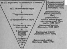 Рис. 79. Исследовательская стратегия, использованная при разработке «Шестнадцать личностных факторов* опросника сти между переменными. Не удалось верифицировать и исходную гипотезу об идентичности структурных элементов в факторах, выделенных на основе L-дан-ных и тех, которые выделены на основе Q-данных. В факторах, выделенных из L-данных, обнаруживаются те, которым нет соответствия в факторах, выделенных из Q-данных, и наоборот. Исключительно низки интеркорреляции переменных, якобы характеризующих один и тот же фактор, но полученных из разных источников (L- и Q-данные). Сказанное позволяет сделать вывод о том, что Р. Кэттелл принял факторный анализ за гораздо более эффективный инструмент познания личности, чем он фактически является. Коэффициент надежности шкал-факторов «Ш. л. ф.» о., определенный путем расщепления, находится в пределах 0,71 — 0,91. Коэффициент надежности ретес-товой через двухнедельный промежуток — 0,36-0,73. Автор также сообщает о достаточно высокой валидности опросника. Р. Кэттеллом и его сотр., помимо двух основных форм «Ш. л. ф.» о. (А и В), разработаны формы С, D и Е. Формы С и D сокращенные, по 105 заданий, и предназначены для лиц, имеющих более низкий уровень образования. Форма Е используется для обследования тех, кто малограмотен (в 1985 г. опубликованы нормы для заключенных, культурно неприспособленных и т. п. лиц). Б. Брианом в 1987 г. на основе формы Е предложен компьютерный (см. Тесты компьютерные) «Профессионально-личностный отчет» (Vocational Personality Report), предназначенный для использовании в консультациях по выбору работы и службах планирования для малограмотных. Известны варианты опросника для детей и подростков. Существует специальное «патологическое» дополнение к «Ш. л. ф.» о., которое состоит из 12 клинических факторов-шкал. Возможно групповое обследование. Опросник нашел достаточно широкое распространение в психодиагностических исследованиях стран СНГ. Однако адаптация «Ш. л. ф.» о. не завершена, несмотря на проведенную проверку соответствия зарубежных и отечественных нормативных данных. Анализ воспроизводимости факторов опросника на русскоязычных выборках (Ю. М. Забродин с со-авт., 1987) показывает, что нельзя считать гомогенными факторы А, С, /, L, М, N, Qii Qi (°T одной четверти до одной трети вопросов отечественного варианта «Ш. л. ф.» о. не коррелируют значимо с соответствующим фактором). Это требует переформулирования вопросов (утверждений) или отказа от диагностических категорий Р. Кэттелла. В 1990 г. В. М. Русаловым и О. В. Гусевой на основе выделенных гомогенных шкал предложен сокращенный вариант опросника под названием 8 PF (70 вопросов). ШКАЛА ВЕРБАЛЬНАЯ — форма фиксации данных в шкалах измерительных, опирающаяся на набор суждений о наличии или степени выраженности изучаемого признака. Такие суждения могут быть представлены в виде полярных определений (свернутая Ш. в.), напр.; лабильность—ригидность; активность— пассивность; общительность—замкнутость (см. Семантический дифференциал). Развернутая Ш. в. включает определения степени выраженности признаков, напр.: результат операции — отличный (хороший), удовлетворительный (слабоудовлетворительный), неудовлетворительный. Другим примером может послужить шкалирование ответа на пункт опросника: — Обведите кружком номер ответа, который в наибольшей степени соответствует Вашем