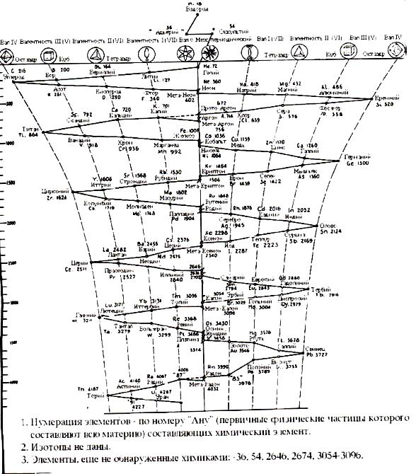 Наш следующий вопрос касается “электронных облаков”, наблюдаемых в атоме. И Род Джонсон и Дэн Винтер отмечали, что в атоме “электронные облака” тетраэдральной формы будут совершенно соответствовать граням Платоновых Твердых Тел. Винтер называет “электронные облака” “вихревыми конусами”. Рис. 3.6 – это, к сожалению, неразборчивая копия Периодической Таблицы Элементов, разработанной Сэром Уильямом Круксом[11] – хорошо известным и высоко уважаемым ученым начала 20-го века, позже ставшим исследователем в области парапсихологии. Внизу рисунка мы видим иллюстрацию того, как “вихревые конусы” соответствуют каждой грани Платоновых Твердых Тел.