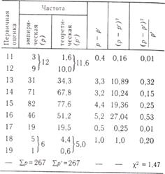 где р' — теоретически вычисленные или ожидаемые частоты эмпирического ряда, f(z) — значение функции нормированного отклонения (см. Нормальное распределение, Стандартизация, Оценки шкальные), п — общее число наблюдений, λ — величина классового интервала или промежуток между соседними классами эмпирического ряда, Sx — среднее квадратичное отклонение эмпирического ряда. Для приведенного выше примера расчет сводится к нормированию эмпирического ряда, т. е. отнесению отклонений xi от средней К. χ 2 можно использовать для сравнения эмпирических рядов с частотами, распределенными по одним и тем же классам. В этом случае применяется формула: