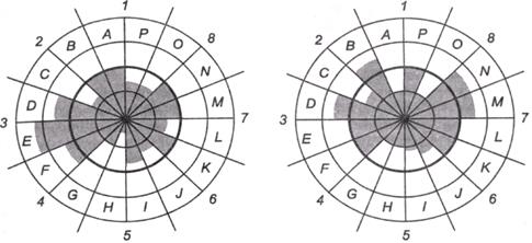Рис. 35. Профили личности (дискограммы) по методике Т. Лири Количественные показатели (баллы, по числу совпадений с ключом) откладываются на соответствующей номеру октанта координате, каждая из которых размечена дугами. Расстояние между дугами кратно четырем (0, 4, 8, 12, 16). На уровнях, соответствующих полученным баллам, в каждом октанте проводится дуга. Отделенная внутренняя часть октанта заштриховывается. Полученные оценки профильные наглядно показывают преобладающий стиль межличностных отношений. Показатели, не выходящие за уровень 8 баллов, соответствуют «гармоническим личностям». Более высокие показатели соответствуют акцентуации определенных поведенческих стереотипов. Оценки, достигающие уровня 14-16 баллов, свидетельствуют о трудности социальной адаптации. Низкие показатели по всем октантам (0-3 балла) могут быть результатом скрытности или неоткровенности испытуемого. Если в дискограмме отсутствуют октанты, закрашенные выше уровня 4 баллов, данные обследования считаются сомнительными. Предполагается, что испытуемые не проявили должной откровенности. Первые четыре типа межличностного поведения, соответствующие I-IV октантам, характеризуются преобладанием неконформных тенденций и склонностью к конфликтам (III и IV), выраженной независимостью мнений, упорством, тенденцией к лидерству (I и II). Другие четыре октанта (V-VIII) представляют противоположную тенденцию. У лиц с высокими показателями по ним преобладают конформистские установки, покладистость (VII и VIII), неуверенность, склонность к компромиссам (V и VI). Интерпретация данных должна опираться главным образом не на абсолютные величины приведенных показателей, а на совокупность их взаимоотношений. Дополнительно к анализу дискограммы могут быть рассчитаны «фактор доминантности» (Y) и «фактор доброжелательности» (G) по приведенным ниже формулам:
