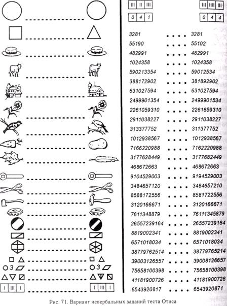 Рис. 73. Невербальный тест Бернштейна Альтернативным по отношению к Т. п. видом психодиагностических методик являются тесты вербальные, хотя их противопоставление носит несколько условный характер. Об этом, в частности, свидетельствуют и высокие показатели корреляции между невербальными и вербальными субтестами в некоторых тестах интеллекта (см. Векслера измерения интеллекта шкалы). В типичных заданиях Т. п. могут присутствовать и вербальные элементы (инструкция, ответ испытуемого). ТЕСТЫ РЕЗУЛЬТАТИВНОСТИ (англ power tests) — тип методик, ориентированных на измерение или констатацию результата, достигнутого испытуемым при выполнении тестового задания. При этом показатель скорости работы испытуемого не принимается во внимание или имеет вспомогательное значение. В этом отношении Т. р. противоположны тестам скорости. Следует отметить, что временное ограничение выполнения заданий может применяться и в Т. р., однако оно, как правило, служит целям стандартизации процедуры исследования или экономии времени при обследовании. К группе Т. р. относятся большинство методик исследования личности, проективные тесты, анкеты и опросники и т. д. ТЕСТЫ СКОРОСТИ (англ, speed tests) — тип психодиагностических методик, в которых основным показателем продуктивности работы испытуемых является время выполнения (объем) задач тестовых. Типичные Т. с. обычно включают большое количество однородных заданий (пунктов). Объем материала выбирается таким образом, чтобы за отведенное (постоянное для всех испытуемых) время ни один из обследованных не успевал справиться со всеми задачами. Тогда показателем продуктивности будет количество правильно выполненных заданий. В качестве типичного примера Т. с. можно привести корректурную пробу. Показателем результативности выполнения Т. с. может являться и прямое измерение времени выполнения задания (напр., таблицы Шульте). Для Т. с., состоящих из большого количества простых заданий, имеются особые процедуры определения надежности (см. Надежность частей теста), внутренней согласованности и дискриминативности заданий теста. Трудность заданий в Т. с. обычно невысока и примерно одинакова. Большинство психометрических тестов интеллекта, общих и специальных тестов достижений являются Т. с. Ряд тестовых методик могут применяться и как Т. с., и как альтернативный вид — тесты результативности (см. Равена прогрессивные матрицы}. Ограничение времени выполнения не является абсолютным критерием отнесения данной методики к группе Т. с. Так, при составлении рассказов в тематической апперцепции тесте продолжительность работы испытуемого регламентирована в целях сокращения времени обследования, интенсификации работы тестируемого. Вместе с тем при оценке и интерпретации результатов обследования временной показатель малосуществен. ТЕСТЫ СПЕЦИАЛЬНЫХ СПОСОБНОСТЕЙ — группа психодиагностических методик, предназначенных для измерения уровня развития отдельных аспектов интеллекта и психомоторных функций, преимущественно обеспечивающих эффективность в конкретных, достаточно узких областях деятельности. В этом отличие Т. с. с. от тестов интеллекта, направленных на измерение общего уровня интеллектуального развития и валидизируемых по отношению к наиболее широким сферам деятельности. Валидизация Т. с. с. осуществляется по отно