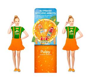 Промо-текст для работы: Здравствуйте! Попробуйте «Pulpy»! Секрет его вкуса – в цельной мякоти апельсина. Мы встряхнули бутылочку, чтобы вы насладились этой мякотью до последней капли! Вам понравилось? Покупайте и участвуйте в онлайн игре (показывает адрес группы на стойке).
