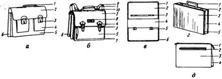 А. Чемодан: 1 - край крышки; 2 - карман крышки; 3 - ремень прочности; 4 - застежка-молния кармана; 5 - крепление застежки; 6 - крышка; 7 - ручка; 8 - пряжка; 9 - торцовая (боковая) стенка Б. Мелки заплечные (рюкзаки): а - без подпорки; б - с подпоркой; 1 - плечевые ремни; 2 - верхний клапан; 3 - вставочный бочок; 4 - ремень-застежка; 5 - клапан кармана; 6 - карман; 7 - подпорка а - курьерский: 1 - ручка со скобами; 2 - клапан; 3 - замок; 4 - наружный карман; 5 - лицевая стенка; 6 - боковая стенка; б - ранец детский: 1 - ручка; 2 - клапан; 3 - замок; 4 - пряжка; 5 - лицевая стенка; 6 - ботан; 7 - окантовка; 8 - эмблема; 9 - плечевой ремень; 10 - замок ремня; в - одинарный: 1 - наружный край большого клапана; 2 - внутренняя сторона большого клапана; 3 - металлическая пластинка для крепления ручки; 4 - малый клапан; 5 - замок; 6 - металлический угольник; г - дипломат: 1 - ручка; 2 - замок; 3 - лицевая стенка; 4 - боковая стенка; 5 - окантовка; д - папка: 1 - застежка-молния; 2 - прорезной карман; 3 - лицевая спинка; 4 - ботан (боковая стенка)