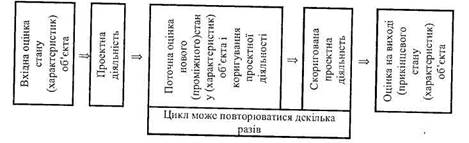 Рис. /. Схема управління проектною діяльністю за ланцюгом "оці-нка-коригування '' Як видно з рисунку ланцюг "оцінка—коригування" діє у такий спосіб: ^ здійснюється вхідна оцінка наявного стану (чи істотних характеристик) об'єкта оцінки (наприклад, користувачів, ресурсів, охоплення); ■^ протягом певного часу оцінка не проводиться. У цей час триває проектна діяльність, яка справляє свій вплив на об'єкт, що був підданий вхідній оцінці. Цей вплив призводить до змін стану (характеристик) об'єкта, що оцінювався, тобто він набуває вже нового (проміжного) стану (або істотні характеристики набувають нових значень), ще невідомого оцінювачам; ^ здійснюється нова (поточна) оцінка, яка показує новий стан (характеристики) об'єкта; ■^ відбувається порівняльний аналіз даних вхідної і поточної оцінки, який показує відповідність або невідповідність змій, що сталися завдяки проектній діяльності, очікуваним результатам проекту. Якщо визначена неповна відповідність, очевидно, слід змінити якісь характеристики проектної діяльності на майбутнє, аби отримати саме очікувані результати, а не якісь інші. Така зміна діяльності на підставі даних оцінки і є коригуванням. Коригування потрібне майже завжди, тому що а) людська діяльність взагалі не часто буває цілком досконалою і в більшості випадків має резерви для удосконалення; б) запланована діяльність далеко не завжди може бути точно виконана — життя вносить свої корективи; в) соціальні проекти являють собою настільки складну сферу людської Теоретичні основи соціальної роботи