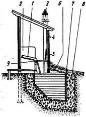 а - деревянный срубовый: 1 - глиняный замок; 2 - булыжная отмостка; 3 - слой песка; 4 - земляная засыпка; 5 - шатер; 6 - гравийный фильтр; 7 - сруб; 8 - стойка; 9 - ручка; 10 - ворот; б - каменный: 1 - тяга; 2 - железные скобы лестницы; 3 - глиняный замок; 4 - опускная деревянная рама с режущим ножом из углового железа; 5 - труба водопровода; 6 - тяга насоса; 7 - ручка насоса; 8 - стояк ручки насоса; 9 - насос; 10 - крышка колодца