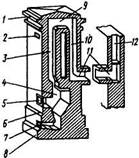 1 - карниз; 2 - душник; 3 - подъемный канал; 4 - топливник; 5 - топочная дверка; 6 - уступ; 7 - поддувальная дверка; 8 -цоколь; 9, 10 - дымообороты; 11 - переходный канал; 12 - дымовой канал