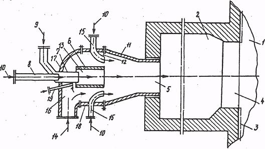 Рисунок 5.20 – Схема муфельного предтопка с соплами высоконорного воздуха: 1, 2 – центральная и периферийные камеры сгорания; 3 – экран; 4 – окно; 5 – горелочное устройство; 6 – циркуляционная труба; 7, 8, 15, 16, 19 – сопла; 9, 10 – ПВК;11 – насадок; 12, 13 – кольцевые зазоры; 14 – подвод горячего воздуха; 17 – стенка; 18 – цилиндрическая вставка
