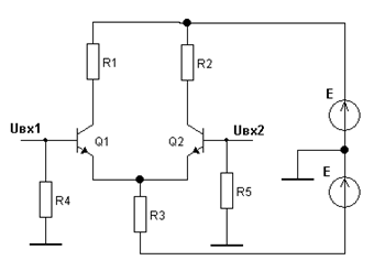 Если на оба входа подать равные напряжения, напряжение на эмиттере станет равным входному напряжению, изменение тока в R3 будут определяться значением входного напряжения. Изменения токов в транзисторах будут равны половине изменения тока в R3. В результате, изменения напряжений на коллекторах транзисторов составит: