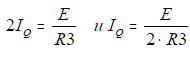 При равных сопротивлениях резисторов в коллекторных цепях транзисторов и одинаковых параметрах транзисторов коллекторные токи равны и разность напряжений на коллекторах равна 0, если равны напряжения на базах транзисторов. У симметричной схемы дифференциального усилителя имеются два входа. Обычно используется один выход (с коллектора транзистора), сигнал с которого, как правило, поступает в дальнейшем на каскады усилителя постоянного тока. В этом усилителе понадобятся схемы, осуществляющие сдвиг уровня, так как напряжение покоя на коллекторе Т1 составляет примерно E / 2 относительно земли. Будем считать транзисторы идентичными и коллекторный ток покоя в каждом из них равными IQ. В этом случае ток эмиттера каждого транзистора приблизительно равен IQ, а ток в общем эмиттерном резисторе R3 примерно равен 2IQ. Поскольку база каждого транзистора соединена с землей (через резисторы R4 и R5), то из этого следует, что потенциал эмиттеров также примерно равен потенциалу земли (в действительности, конечно, на 0,6 В ниже потенциала земли), и поэтому ток в R3: