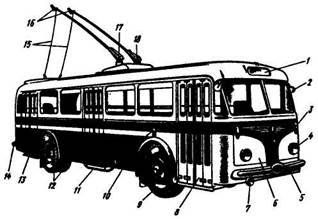 1 - стекло заднего окна; 2 - боковой вентиляционный люк; 3 - вентиляционный люк на крыше; 4 - передняя дверь; 5 - крышка багажного отсека; 6 - боковое окно; 7 - шаг сиденья; 8 - сдвоенное сиденье; 9 - сиденье водителя; 10 - ширина прохода; 11 - продольная балка крыши; 12 - плафон внутреннего освещения; 13 - багажная полка; 14 - панель пола; 15 - багажный отсек; 16 - панель днища кузова; 17 - продольная балка пола; 18 - стойка сиденья; 19 - обивка сиденья 1 - указатель маршрута; 2 - зеркало заднего вида; 3 - рассеиватель указателя поворота; 4 - фара; 5 - передний бампер; 6 - передняя панель облицовки; 7 - противотуманная фара; 8 - передняя дверь; 9 - переднее колесо; 10 - боковой повторитель указателя поворота; 11 - средняя дверь; 12 - задние сдвоенные колеса; 13 - задняя дверь; 14 - задний бампер; 15 - гибкая тяга для управления токосъемниками; 16 - токосъемники; 17 - штанга; 18 - кронштейн штанги