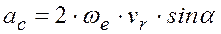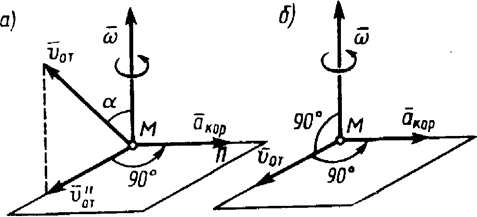где α – угол между векторами Из данной формулы видно, что Кориолисово ускорение может обращаться в нуль в следующих случаях: 1) ωe =0, т. е когда переносное движение является поступательным или если переносная угловая скорость в данный момент времени обращается в нуль; 2) vr =0, т. е. когда относительная скорость в данный момент времени обращается в нуль; 3) когда α =0 (180º), т. е. когда относительное движение происходит по направлению, параллельному оси переносного вращения. Направление вектора 1. проецируем вектор относительной скорости 2. в этой плоскости разворачиваем полученную проекцию вектора на 90º по направлению переносного вращения (по направлению ωe) - это и есть направление кориолисова ускорения.