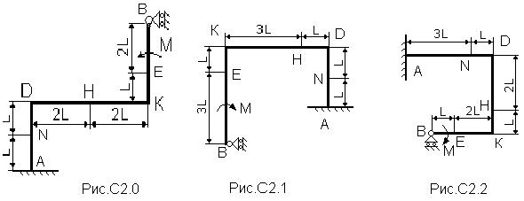 Задача С2 Рама, состоящая из двух абсолютно твердых ломаных стержней, соединенных между собой шарниром, (рис. С2.0 – С2.9, табл. С2) закреплена в точке А жесткой заделкой, а в точке В прикреплена к шарнирной опоре на катках. Положение шарнира указано в табл.С2. На раму действуют: пара сил с моментом М=100 Н×м и сила, значение, направление и точка приложения которой указаны в таблице (например, в условиях № 1 на раму действует сила F1 = 10 Н под углом 30° к горизонтальной оси, приложенная в точке D), а также распределенная нагрузка интенсивностью q=20 Н/м, приложенная на участке, указанном в таблице. Если распределенная нагрузка приложена на горизонтальном участке, то она действует вниз, а если на вертикальном, то вправо. Определить реакции связей в точках А и В, вызываемые заданными нагрузками, а также реакцию внутренней связи. При окончательных подсчетах принять L =0,5 м. Указания. Задача С2 - на равновесие составных конструкций под действием плоской системы сил. Для определения всех силовых факторов в заделке и реакций шарнирной опоры и внутренней связи необходимо рассмотреть равновесие каждого тела, из которых состоит рама, отдельно, учитывая, что силы взаимодействия между телами равны по величине и противоположны по направлению.