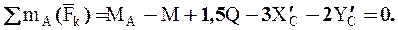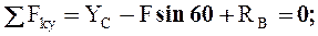 1. SFkx = 0, XB + RC sinb - F cosa = 0; 2. SFky = 0, УB + RC cosb + F sina = 0; 3. SmB(Fk) = 0, M - RCcosb×4 L + F cosa × 2 L = 0.