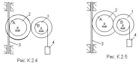 Числовые значения всех величин, входящих в правую часть выражения (5), определены и даются равенствами (3) и (4). Подставив в (5) эти числа, найдем сразу, что при t1=1 c a1t= 1,4 см/с2. Нормальное ускорение точки Радиус кривизны траектории r = V2/an. Подставляя сюда числовые значения V1 и a1n, найдем, что при t1=1 c r1 =5,59 см. Задача К2 Механизм состоит из ступенчатых колес 1, 2, связанных ременной передачей, зубчатой рейки 3 и груза 4, привязанного к концу нити, намотанной на одно из колес (рис. К2.0 - К2.9, табл. К2). Радиусы ступеней колес равны соответственно: у колеса 1- r1 = 2 см, R1 = 4 см, у колеса 2 - r2 = 6 см, R2 = 8 см. На ободьях колес расположены точки А и В.