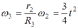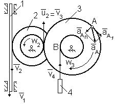Решение. Условимся обозначать скорости точек, лежащих на внешних ободах колес (радиуса Ri), через vi, а точек, лежащих на внутренних ободах (радиуса ri), - через ui. Определяем сначала угловые скорости всех колес как функции времени t. Зная закон движения рейки 1, находим ее скорость: v1 = Так как рейка и колесо 2 находятся в зацеплении, то v2=v1 или w2R2=v1. Но колеса 2 и 3 тоже находятся в зацеплении, следовательно, u2=v3 или w2r2=w3R3. Из этих равенств находим