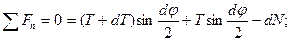 Здесь T и (T+dT) - силы натяжения нити на правом и левом концах элемента, соответственно, dN - сила нормального давления, приложенная со стороны цилиндра к элементу нити,