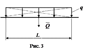 Сила может быть распределена по линии (рис.3), по площади или по объему (Н/м, Н/м2, Н/ м3). Распределенную нагрузку заменяют сосредоточенной силой, равной площади эпюры нагрузки и приложенной в центре ее тяжести. Например, если: L = 2м, а q = 5 кН/м, то: Q = q×L = 10 кН.