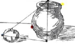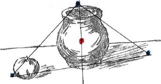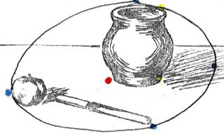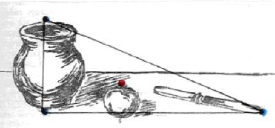 Добавив нож и разбив тем самым монотонную линию низа композиции, удалось вписать предметы в приблизительный овал, но при этом образовались две разобщенные группы: яблоко с ножом и горшок с тенью, никак не связанные между собой.