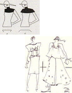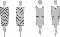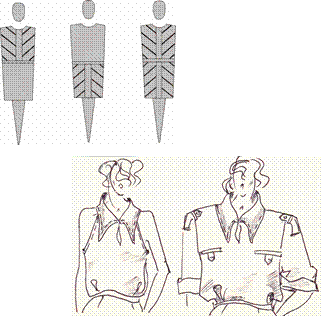 Переоценка острого угла. Обычные небольшие расстояния, заключенные между сторонами острых углов, переоцениваются и кажутся большими, чем они есть на самом деле. Большие же расстояния между сторонами тупых углов недооцениваются. Следствием иллюзий острого угла является увеличение предметов, расположенных между сторонами этого угла. Тупые углы на концах прямой удлиняют линию, острые – укорачивают. Это своего рода иллюзия подравнивания: если расстояния кажутся больше, то и предметы, находящиеся между сторонами угла тоже как бы увеличиваются. Иллюзия тем ярче, чем ближе расположен предмет к вершине угла. Используя иллюзии острого угла, можно добиться значительного расширения или заужения отдельных участков фигуры, например, плеч, бедер; можно зрительно увеличить или уменьшить длину тела. Так, очертания рукава, расширяющегося к низу, увеличивают длину руки, а расширенные в верхней части оката – уменьшают. Форма выреза горловины и размер воротника при индивидуальном изготовлении одежды выбираются с учетом характера всей фигуры, овала и черт лица, формы и длины шеи. Если линия выреза повторяет очертание лица, то она его подчеркивает: узкое лицо кажется еще уже, а широкое – шире. Поэтому женщинам, у которых лицо имеет слишком квадратную или округлую форму, рекомендуется вырез горловины овальной удлиненной формы слегка корректирующий овал лица. Иллюзия незамкнутого контура может быть применена, когда необходимо увеличить размеры какой-либо части фигуры. Например, следует избегать замкнутого контура воротника, если шея короткая. В изделии на фигуру с широкими плечами расходящаяся незаконченная линия воротника производит менее благоприятное впечатление, чем замкнутая.