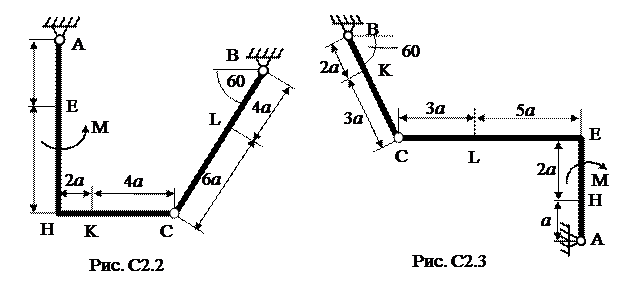 Если реакции найдены верно, то уравнение (4) обратится в тождество. Ответ: x А=-8,5 кН; y А=-23,3 кН; RB=7,3 кН. Знаки указывают, что силы Задача С2 Конструкция состоит из жесткого угольника и стержня, которые в точке С или соединены друг с другом шарнирно (рис. С2.0 – С2.5), или свободно опираются друг о друга (рис. С2.6-С2.9). На каждую конструкцию действует: пара сил с моментом М=60 кН×м, равномерно распределенная нагрузка интенсивности q = 20 кН/м и еще две силы. Эти силы, направления и точки их приложения указаны в табл. С2; там же в столбце «Участок» указано, на каком участке действует распределенная нагрузка. Определить реакции связей в точках А, В, С и D, вызванные заданными нагрузками. При окончательных расчетах принять: а = 0,2 м. Направление распределенной нагрузки на различных по расположению участках указано в табл. С2а. Указания. Задача С2- на равновесие системы тел, находящихся под действием плоской системы сил. При ее решении можно рассмотреть сначала равновесие всей системы в целом, а затем – равновесие одного из тел системы, изобразив его отдельно, или же сразу расчленить систему и рассмотреть равновесие каждого из тел в отдельности, учтя при этом закон о равенстве действия и противодействия. Проверка решения обязательна.