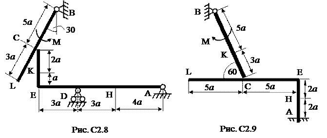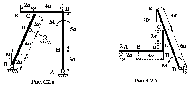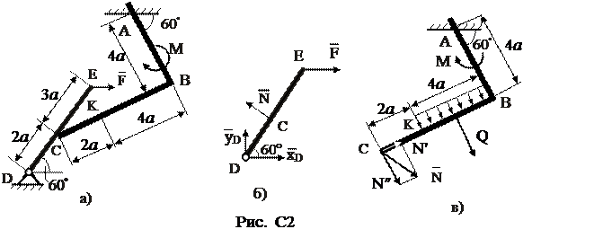 Пример C2. На угольник ABC (<ABC=90˚), конец А которого жестко заделан, в точке С опирается стержень DE (рис. С2, а).