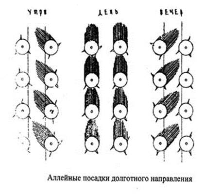 Открытые пространства поляны, лужайки и водные зеркала должны быть размещены таким образом, чтобы в саду в течение всего дня были целесообразно распределены свет и тень. Это легче осуществить в больших композициях, где можно предусмотреть различную ориентацию больших пространств. При проектировании должно быть соблюдено равновесие между светлыми и затененными пространствами, предусмотрены переходы, нюансы, оттенки.