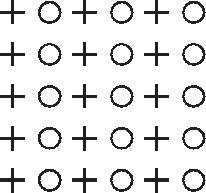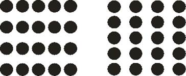Рис. 7. Группировка по внешнему сходству элементов (вертикали из «+» и «0») «Общая судьба» (дополнение к ранее описанной тенденции восприятия кривых в осях координат). Если группа точек или каких-либо других элементов движется относительно окружения в одном и том же направлении и с одинаковой скоростью, то возникает тенденция воспринимать эти элементы как самостоятельную фигуру. Близость. Если элементы расположены близко друг от друга, то они будут восприниматься как единая форма. Одно и то же число кружков можно сгруппировать по-разному. На рисунке мы видим фигуру, сформированную из горизонталей, а во втором из вертикалей.