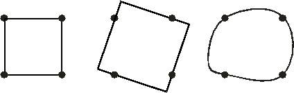 Простота формы. Восприятие лучше настраивается на простоту форм. Треугольник с усеченными углами (трапеция) все равно будет восприниматься как треугольник. Простой будет считаться форма с наиболее очевидным построением. Ее легче воссоздать из заданных элементов, принимаемых за точки. Четыре точки, расположенные попарно на равных расстояниях друг от друга, соберутся в квадрат (рис. 11,а), а не в круг, трапецию или другую фигуру.
