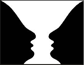 Рис. 12. Направленность элементов: а) по принципу параллельной композиции; б) беспорядочная Форма воспринимается как целостная структура, в первую очередь из-за ее организации, а не формосоставляющих ее элементов. Прямоугольник из прямых параллельных линий, образованных кружками, будет восприниматься аналогично, если образующие элементы линий заменить квадратами или треугольниками такого же размера. В то же время, если элементы достаточно большие по отношению к тем фигурам, в которые они предположительно должны собираться, или же просто разбросаны по листу, то они уже организуются по принципу подобия - круги к кругам, треугольники к треугольникам и т. п. Также, поскольку образ должен быть целостным, то он обычно додумывается (полукруг и две точки воспринимаются как лицо). Такой подход встречается в японской графике. Также, несмотря на то что мы не можем видеть предмет изображения сразу со всех сторон, остальные детали мысленно дорисовываются. Египтяне, рисуя фигуру, изображали лицо в профиль, но с развернутым торсом. Достраивание путем повторения элемента в пределах одной формы создает эффект отражения и служит для еще большего проявления целостности образа. Деформация. Далеко не всегда объективные данные о форме, о ее размерах, соотношении с другими формами, значительности занимаемого ею места в композиции совпадают с образными представлениями мастера. Деформация, если она не носит чисто формального характера, служит более интенсивному выражению художественной правды. Деформация интенсифицирует художественное выражение, часто более внятно определяя намерения мастера. Карикатура, гротеск - одно из простейших приемов деформации. Форма и фон. Наша способность видеть - это прежде всего умение выделять видимую информацию (форму) среди окружения (фона). Наше восприятие картинной плоскости основано на этом же принципе: чтобы увидеть ее, надо различить форму на фоне. Изображение может проявиться на фоне благодаря выделенному контуру. Само изображение также должно какое-то время удерживать внимание. Это возможно только при соблюдении основных законов композиции. Знаменитый пример датского психолога Э.Рубина - два черных профиля и белая ваза между ними (рис. 13).