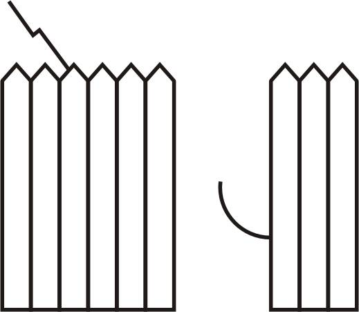 Рис. 15. В зависимости от направления внимания на левый или правый край рисунка воспринимаются колонки с утолщением или сужением в середине Прошлый опыт. Влияние этого фактора обнаруживается в тех случаях, когда изображение имеет определенный смысл. Например, если без промежутков между словами написать осмысленную фразу, то персептивно она все же распадается на части, соответствующие отдельным словам: СОБАКАЕСТМЯСО. Другим примером может быть восприятие загадочных картинок. Для неопытного наблюдателя (рис.16) представляет собой случайное нагромождение линий, однако, как только он узнает, что на рисунке изображены солдат с собакой, проходящие мимо дыры в заборе, линии объединяются в одно осмысленное целое