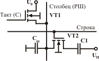 В динамическом оперативном запоминающем устройстве (ОЗУ) функции элемента памяти выполняет кондер. Информация представляется электрическим зарядом. Поскольку время сохранения на кондере заряда ограничено (вследствие утечки), необходимо периодически восстанавливать записанную информацию. Помимо этого, для динамического ОЗУ требуется синхронизация, обеспечивающая последовательность включений функциональных узлов. Для реализации элемента памяти динамического ОЗУ широко применяется схема, показанная на рисунке.