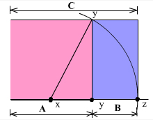 На протяжении многих веков, для построения гармоничных композиций художники пользуются понятием "Золотого сечения". "Золотое сечение" - деление отрезка АС на две части таким образом, что большая его часть АВ относится к меньшей ВС так, как весь отрезок АС относится к АВ (т.е. АВ:ВС=АС:АВ). Это отношение равно примерно 5:8. На основе данного правила существуют различные способы построения гармоничных композиций. Рассмотрим пример: Построим сначала квадрат (выделен розовым цветом).Затем разобьем основание квадрата пополам (точка X). Будем считать точку Х центром окружности, одной из точек которой является вершина квадрата Y. Затем построим окружность до пересечения с продолжением нижней стороны квадрата (точка Z), и построим через точку Z прямоугольник. В результате мы получим прямоугольник с соотношением сторон 5:8. Отношение величин отрезка А к отрезку С, такое же как отрезка В к отрезку А. Отношение 5:8 очень близко к отношению сторон стандартного кадра (24:36 мм = 5:7,5=2:3).