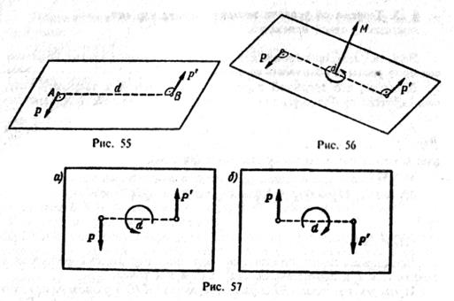 Система двух равных по модулю, параллельных и противоположно направленных сил F и F' называется парой сил. Плоскость, в которой находятся линии действия сил F и F', называется плоскостью действия пары сил (рис. 55). Пара сил не имеет равнодействующей, однако силы пары не уравновешиваются, так как они не направлены по одной прямой. Пара сил стремится произвести вращение твердого тела, к которому она приложена. Пара сил, не имея равнодействующей, очевидно, не может быть уравновешена силой.