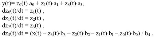 В системе y(t) – функция времени регулируемой величины, то есть временная зависимость реакции САР на воздействие; х(t) – функция времени задающего воздействия; zi(t) – функции времени дополнительных переменных состояния Zi. Численное решение системы дифференциальных уравнений позволяют получить функции Mathcad, реализующие, например, метод Рунге-Кутта четвертого порядка точности (см. Приложение).