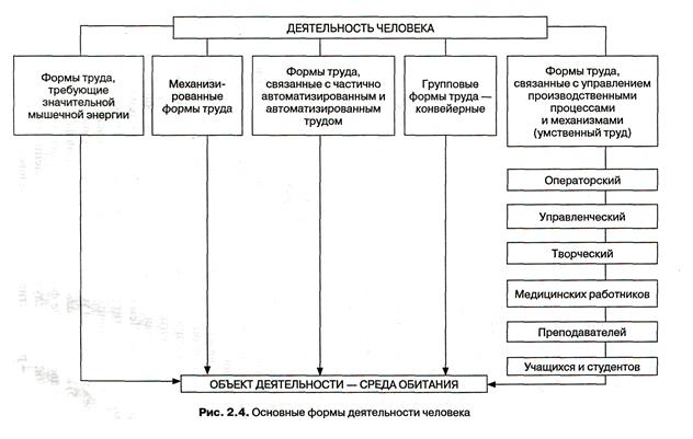 В зависимости от основных характеристик и предъявляемых к организму физиологических требований различают следующие формы труда: физический — отличается значительной мышечной активностью и большими затратами энергии (грузчики и т. п.); механизированный — связан с обслуживанием машин (водители автомобилей и т. п.); автоматизированный и полуавтоматизированный (ткачи, штамповщики и т. п.), иногда требуются большие энергозатраты; конвейерный (групповой) — связан с перемещением изделий в процессе обработки от одного рабочего к другому, может быть легким (сборщики на радиозаводе) и тяжелым (сборщики на тракторном заводе); интеллектуальный подразделяют на труд в сфере материального производства (инженеры, бухгалтеры, операторы станков с дистанционным управлением и т. п.) и вне сферы материального производства (писатели, педагоги и т. п.).