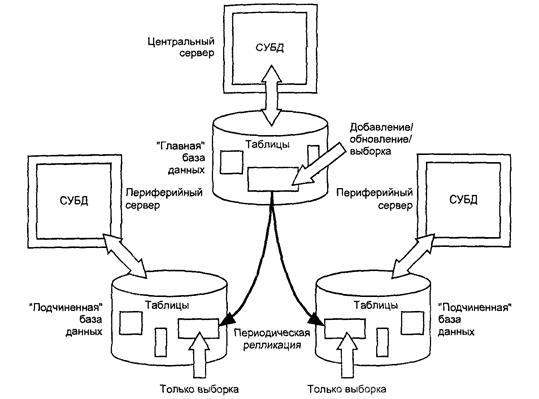 Дублирование таблиц Доступ к удаленным базам данных из локальных СУБД очень удобен при выполнении небольших запросов и нерегулярном доступе к данным. Если же приложению требуется интенсивный и частый доступ к удаленной базе данных, тогда коммуникационные издержки описанной ранее схемы работы могут оказаться неприемлемыми. Когда интенсивность и частота операций удаленного доступа превышает определенный предел, более эффективным оказывается использование локальной копии удаленных данных. Многие производители СУБД предоставляют специальные средства для упрощения процесса извлечения и распространения данных. В простейшем случае содержимое таблицы извлекается из "главной" базы данных, пересылается по сети другой системе и помещается в соответствующую таблицу-реплику в "подчиненной” базе данных (рис.). Эта процедура обычно выполняется периодически во время наименьшей загрузки системы. Такой подход очень удобен в тех случаях, когда данные в реплицируемых таблицах изменяются редко или изменения выполняются в пакетном режиме. Предположим, например, что несколько таблиц нашей учебной базы данных, расположенные в главной системе, должны быть реплицированы в локальные базы данных. Содержимое таблицы OFFICES практически никогда не меняется. Поэтому она будет прекрасным кандидатом для репликации в рабочие базы данных дистрибьюторских центров и торговых менеджеров. После того как локальные таблицы-реплики соответствующим образом созданы и заполнены данными из главной таблицы, их можно обновлять раз в месяц или не обновлять вовсе, пока не будет открыт какой-нибудь новый офис.