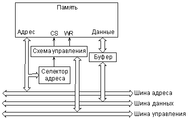 Память микропроцессорной системы выполняет функцию временного или постоянного хранения данных и команд. Объем памяти определяет допустимую сложность выполняемых системой алгоритмов, а также в некоторой степени и скорость работы системы в целом. Модули памяти выполняются на микросхемах памяти (оперативной или постоянной). Все чаще в составе микропроцессорных систем используется флэш-память (англ. – flash memory), которая представляет собой энергонезависимую память с возможностью многократной перезаписи содержимого. Информация в памяти хранится в ячейках, количество разрядов которых равно количеству разрядов шины данных процессора. Обычно оно кратно восьми (например, 8, 16, 32, 64). Допустимое количество ячеек памяти определяется количеством разрядов шины адреса как 2N, где N – количество разрядов шины адреса. Чаще всего объем памяти измеряется в байтах независимо от разрядности ячейки памяти. Используются также следующие более крупные единицы объема памяти: килобайт – 210 или 1024 байта (обозначается Кбайт), мегабайт – 220 или 1 048 576 байт (обозначается Мбайт), гигабайт – 230 байт (обозначается Гбайт), терабайт – 240 (обозначается Тбайт) Например, если память имеет 65 536 ячеек, каждая из которых 16-разрядная, то говорят, что память имеет объем 128 Кбайт. Совокупность ячеек памяти называется обычно пространством памяти системы. Для подключения модуля памяти к системной магистрали используются блоки сопряжения, которые включают в себя дешифратор (селектор) адреса, схему обработки управляющих сигналов магистрали и буферы данных (рис. 7.1). Оперативная память общается с системной магистралью в циклах чтения и записи, постоянная память – только в циклах чтения. Обычно в составе системы имеется несколько модулей памяти, каждый из которых работает в своей области пространства памяти. Селектор адреса как раз и определяет, какая область адресов пространства памяти отведена данному модулю памяти. Схема управления вырабатывает в нужные моменты сигналы разрешения работы памяти (CS) и сигналы разрешения записи в память (WR). Буферы данных передают данные от памяти к магистрали или от магистрали к памяти. В пространстве памяти микропроцессорной системы обычно выделяются несколько особых областей, которые выполняют специальные функции. Память программы начального запуска всегда выполняется на ПЗУ или флэш-памяти. Именно с этой области процессор начинает работу после включения питания и после сброса его с помощью сигнала RESET.