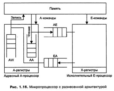 Некоторые из зависимостей по данным могут быть устранены. RAR, по сути дела, соответствует отсутствию зависимостей, поскольку в данном случае порядок выполнения команд не имеет значения. Действительной зависимостью является только "чтение после записи" (RAW), т. к. необходимо прочитать предварительно записанные новые данные, а не старые. Лишние зависимости по данным появляются в результате "записи после чтения" (WAR) и "записи после записи" (WAW). Зависимость WAR состоит в том, что команда должна записать новое значение в ячейку памяти или регистр, из которых должно быть произведено чтение. Лишние зависимости После удаления лишних зависимостей по управлению и данным команды могут исполняться параллельно. Формирование расписания параллельного выполнения команд возлагается на аппаратные средства микропроцессора. Это расписание учитывает существующие зависимости между командами и имеющиеся функциональные модули процессора. В современных микропроцессорах широко используется принцип конвейерного выполнения отдельных элементарных операций. Конвейеризация внутренних процессов позволяет получать результат в каждом процессорном такте. Структурный параллелизм микропроцессоров с разнесенной архитектурой Стремление использовать присущий большинству программ естественный параллелизм вычисления целочисленных адресных выражений и собственно обработки данных в формате с плавающей точкой привело к появлению разнесенных архитектур (decoupled architecture) [11]. В первом приближении микропроцессор с разнесенной архитектурой, как показано на рис. 1.16, состоит из двух связанных подпроцессоров, каждый из которых управляется собственным потоком команд.